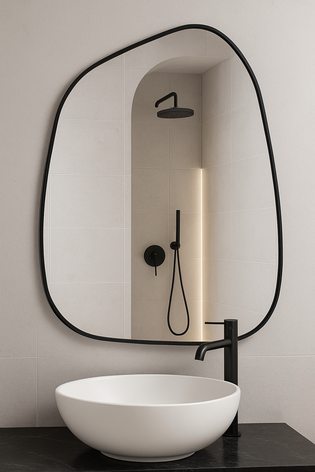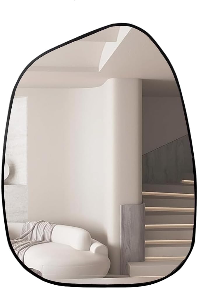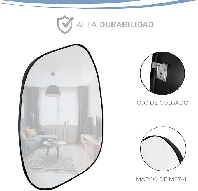 El Espejo Asimétrico GRAVITA combina diseño moderno y elegancia para realzar cualquier espacio. Su forma orgánica y marco metálico negro mate aportan un estilo contemporáneo, ideal para baños, recámaras o entradas.