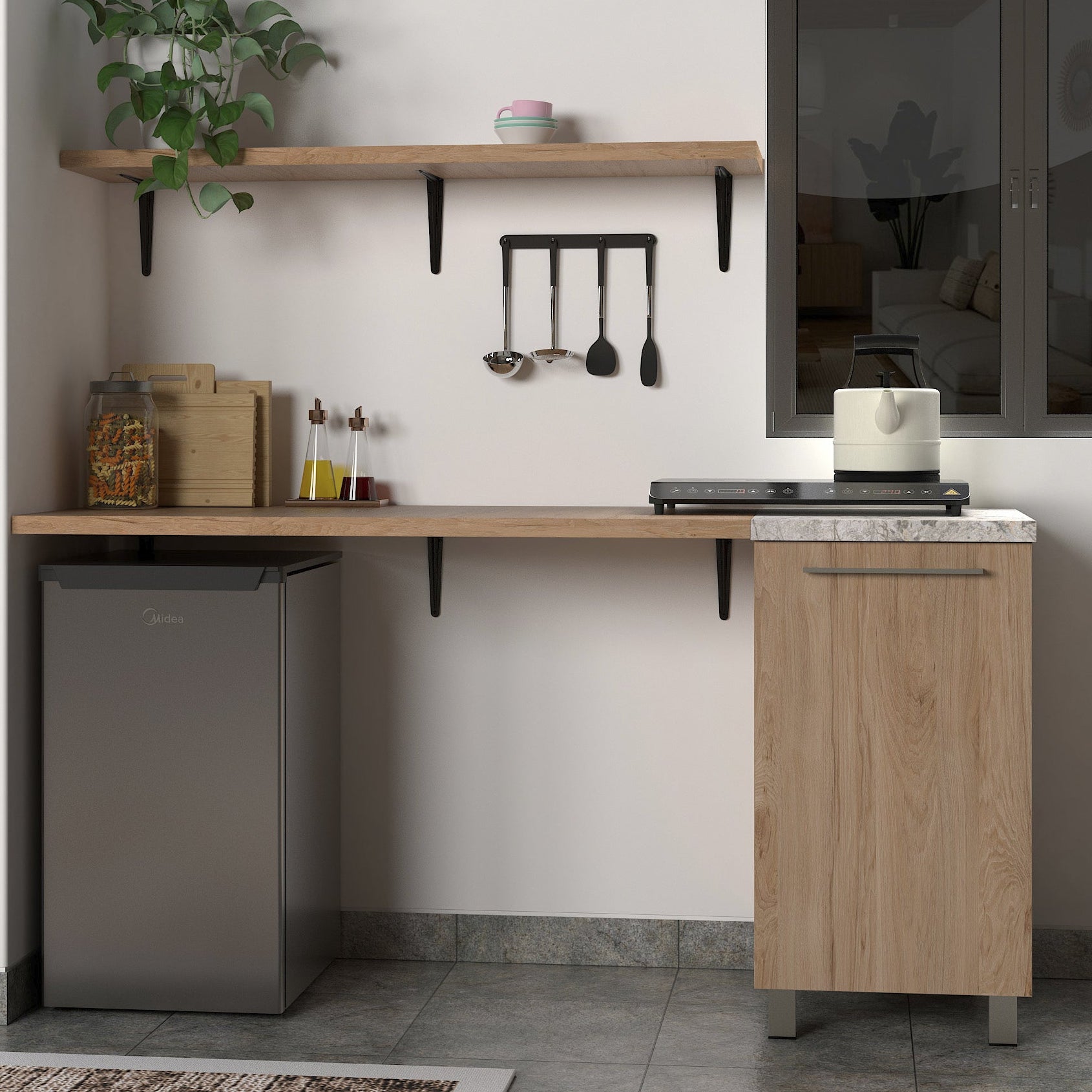 Este gabinete de 50 cm de ancho es una solución práctica para complementar tu cocina o iniciar tu proyecto sin complicaciones. Su diseño limpio con puerta abatible y jaladera metálica ofrece almacenamiento cerrado y discreto para mantener tu espacio ordenado.