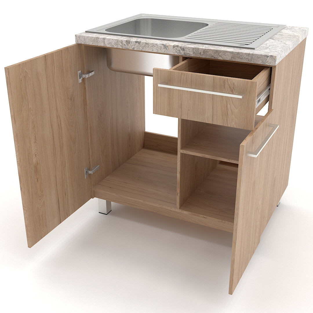 Cuenta con un cajón superior ideal para utensilios de uso diario, y dos puertas abatibles que permiten acceder cómodamente al área inferior, perfecta para almacenar productos de limpieza o aprovechar el espacio bajo fregadero.