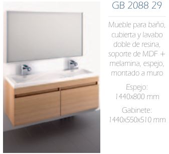 El Gabinete GB 2088 29 es un Mueble para baño de 1.44 m de largo y .55 m de profundidad con cajones de cierre suave. Cuenta con doble lavabo y cubierta de resina. Incluye cespol, contra y espejo para una funcionalidad y estilo óptimos.