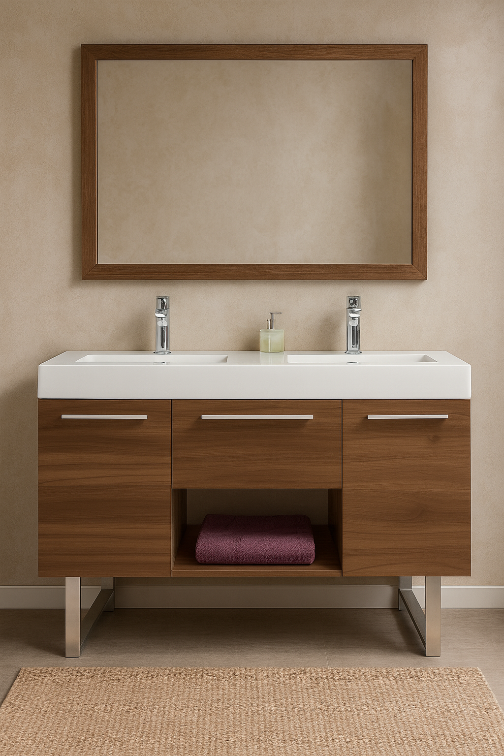 El gabinete GB 2096 29 es una solución moderna y funcional para baños amplios. Su diseño de líneas limpias y acabado color nogal aporta elegancia y calidez a cualquier espacio.