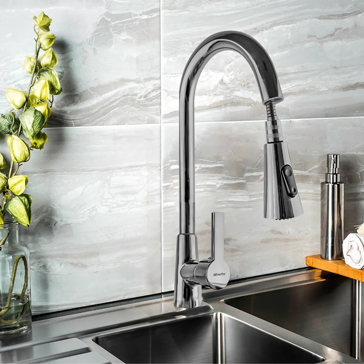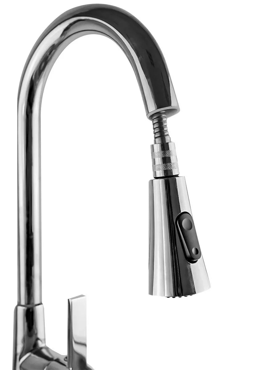 Monomando elegante y funcional con diseño curvo y cabezal extraíble, ideal para cocinas modernas. Su acabado brillante y forma ergonómica ofrecen comodidad y estilo en cada uso.
